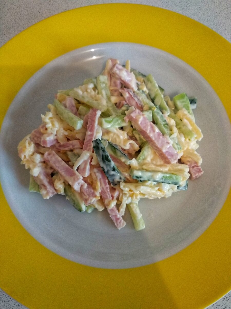 Для этого салата нам потребуются самые простые ингредиенты: Самое продолжительное в этом рецепте это варка яиц, так что целесообразно будет с этого и начать. Закладываем яйца в подсоленную воду, ставим на огонь и варим 10 минут от момента закипания. Как яйца сварятся сразу ставим их под струю ледяной воды, добиваясь тем самым максимального перепады температуры для беспрепятственного очищения от скорлупы. Пока варятся яйца подготовим все остальные продукты. Окорок и огурцы нарезаем соломкой-брусочками, не очень крупно. Сыр натираем на крупной терке, хотя допускается также нарезать брусочками, но это уже более трудоемко. Сваренные и очищенные яйца также натираем на терке. Собираем все компоненты в глубокой миске и добавляем майонез. По желанию можно посолить, но за счет сыра и окорока салат и так получается достаточно соленным и пикантным. Перемешиваем и подаем на стол! Салат получается освежающим за счет огурцов и при это сытным, в общем стоит попробовать. Готовьте с любовью, куш