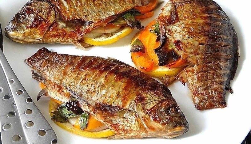 ❶ - Карась, запеченный в сметанном соусе Ингредиенты: ● 150-200 г карасей ● Мука ● Сметана 150 г ● 20 г масла ● 100-150 г картофеля ● Сыр твердый ● Сухари ● Соль, перец, зелень Приготовление: Караси почистить и выпотрошить, промыть. Разделать на порционные куски. Посыпать солью и перцем, и поджарить с обеих сторон на масле. Берем блюдо для запекания в духовке (на ней будем и подавать блюдо), и смазываем сметанным соусом. Соус готовим по вкусу: в сметану добавляем соли, перец, можно еще и специй. Обжаренную рыбу укладываем в блюдо и рядом ложем 2-3 отваренные картофели, желательно небольшого размера. Заливаем рыбу и картофель оставшимся соусом, сверху притрушиваем сухарями и потертым сыром. Можно добавить немножко масла. В духовке запекаем до образования румяной корочки и полной готовности рыбы. На столе блюдо можно украсить зеленью. Приятного аппетита! ❷ - Тушеные караси Ингредиенты: ● 1 кг карасей ● 1 ч.л. сахара ● репчатый лук ● капустные листья ● 100 мл со