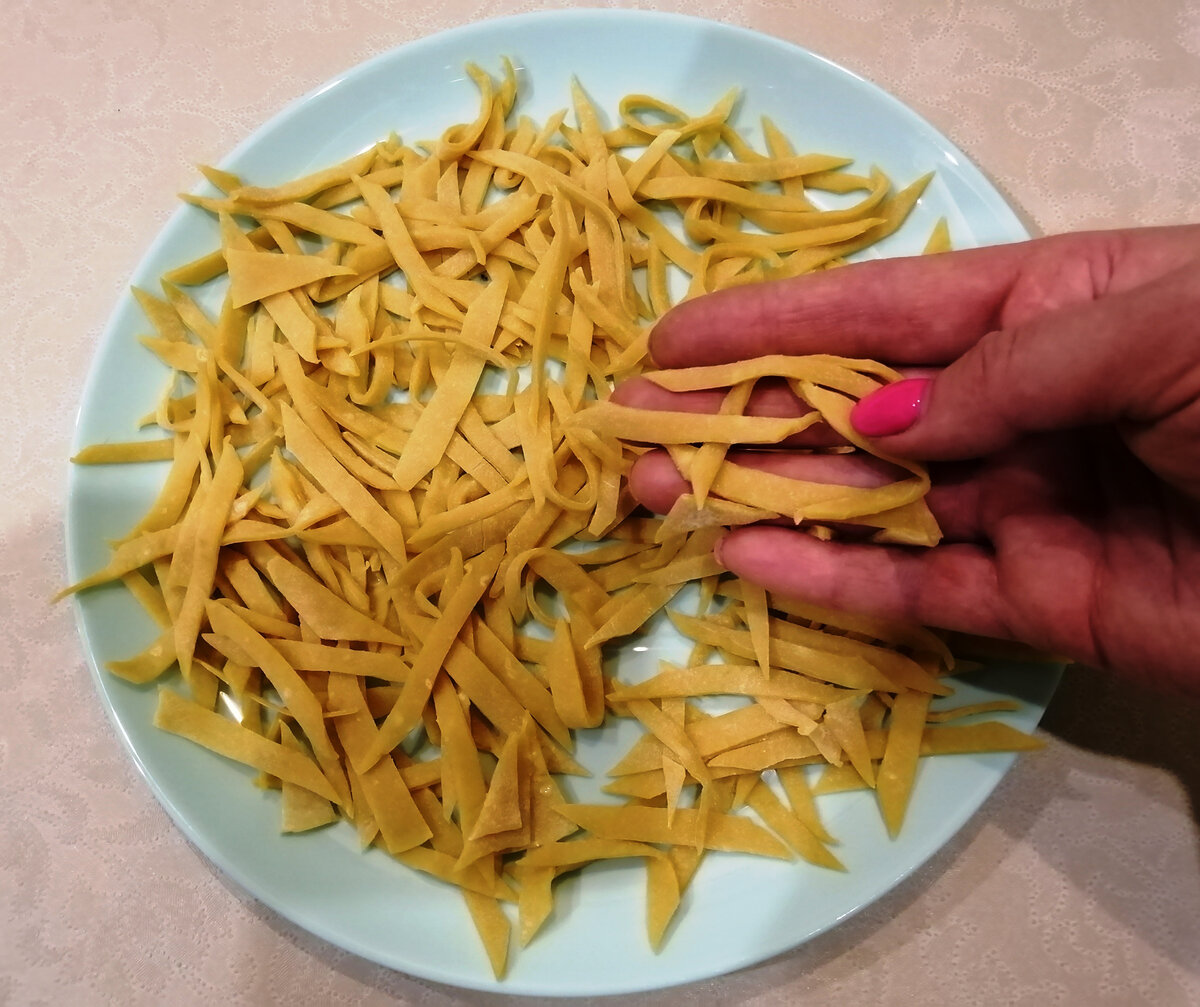 Готовую лапшу оставьте на тарелке подсохнуть и добавляйте в суп. Из-за плотной текстуры лапша в супе хорошо держит форму и не разваривается.
