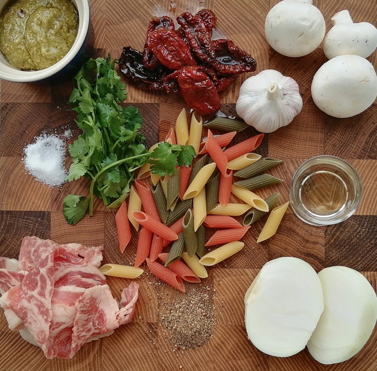 Сегодня приготовил такой простой рецепт пасты, но получилось настолько вкусно, что решил поделиться с вами. Я повторю - очень простой рецепт, настолько, что из всего фотоконтента получилось только два фото, продукты до и после приготовления. Начнём. Необходимые ингредиенты: Паста - 200гр. Лук репчатый - 1 шт. Говяжий бекон - 100гр. Шампиньоны - 5 шт. Кинза - 5гр. Чеснок - 3 зубчика. Песто - 30гр. Вяленые томаты - 7шт. Масло подсолнечное - 10гр. Соль, перец - по вкусу, у меня получилось 0.5 чайной ложки. Приготовление. На сухой сковородке обжариваем говяжий бекон с двух сторон по минуте с каждой стороны. Перекладываем на салфетку, чтобы стек лишний жир. Параллельно ставим кипятить чуть подсоленную воду для пасты, после закипания воды, варить согласно инструкции на пачке. В сковородку из под бекона, добавляем ложку подсолнечного масла и отправляем туда мелко нарезанный лук, а через минуту шампиньоны и натёртый чеснок. Готовим быстро на сильном огне, чтобы у грибов образовался