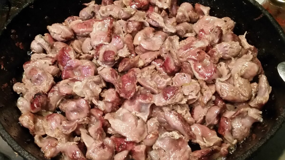 Сперва желудки нужно разрезать пополам, промыть и отварить. Сколько варить не помню- что- то около часа. Короче, пока хрустеть на зубах перестанут. Обжарить на сковороде и сложить в кастрюлю.