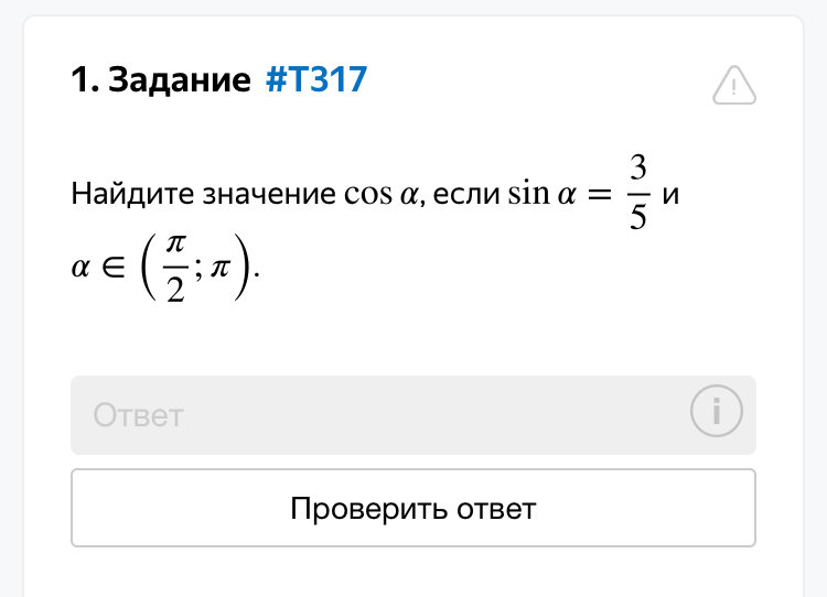 Перед началом обращусь к вам с просьбой. Я пытаюсь помочь вам, а вы помогайте мне :) Обязательно дочитывайте до конца, подписывайтесь на канал, задавайте свои вопросы по математике в комментарии или в соцсетях по ссылкам на канале. Помогайте мне продвинуть канал :) Ранее у нас встречалось задание на тригонометрию, но это было задание ОГЭ. Я говорил, что в ЕГЭ тоже будет задание с тригонометрией, но оно будет отличаться немного. Разберём одно из них: Нужно найти косинус, когда известно значение синуса. Также решаем через основное тригонометрическое тождество. Косинус будет равен +- квадратному корню из 1-синус в квадрате. Именно +-, так как в задание есть условие, которое указывает на знак косинуса. Косинус расположен в интервале. Обозначим этот интервал на единичной окружности: Нужный интервал я советую обводить, чтобы его было четко видно. Косинус в этой части отрицательный. Значит мы выбираем ответ с минусом. То есть извлекаем корень и ставим минус. Вот так совершенно незначительно