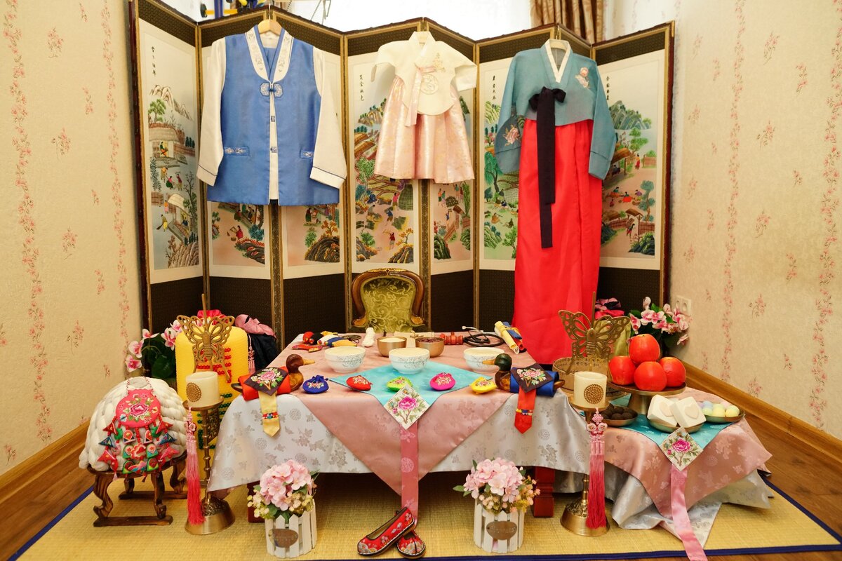 Корейскую традицию Асянди моему сыну в 2013 году мы проводили по-простому: привезли низкий столик, накрыли обычную скатерть и своими силами положили различные предметы, а костюм для ребенка привозили из Кореи наши родственники в подарок. В 2020 году все сильно изменилось: индустрия праздников в Алматы очень сильно развилась за это время, это коснулось и корейских традиционных праздников, поэтому в этот раз мы решили сделать все более красиво, чем в первый раз. Все-таки для девочки это важно, как мне показалось. Результат представлен на фото: Все, что Вы видите на фото, мы взяли в аренду. Приехали люди, которые привезли кучу всяких мешочков и пакетиков, тряпочек, ширму и, непосредственно, 4 костюма: для двух детей и двух родителей. Конечно, изначально я хотела заказать ханбок (корейский национальный костюм) в Корее, как и было у сына, но, признаться честно, качественные, из хорошей ткани наряды стоят недешево. На Алиэкспрессе видела очень большой выбор: от синтетических ханбоков за 2