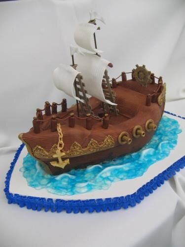 - В подставке вырезала углубления по диаметру мачт, когда собирала торт, воткнула в эти места шпажки, потом их вынула и туда уже мачты.