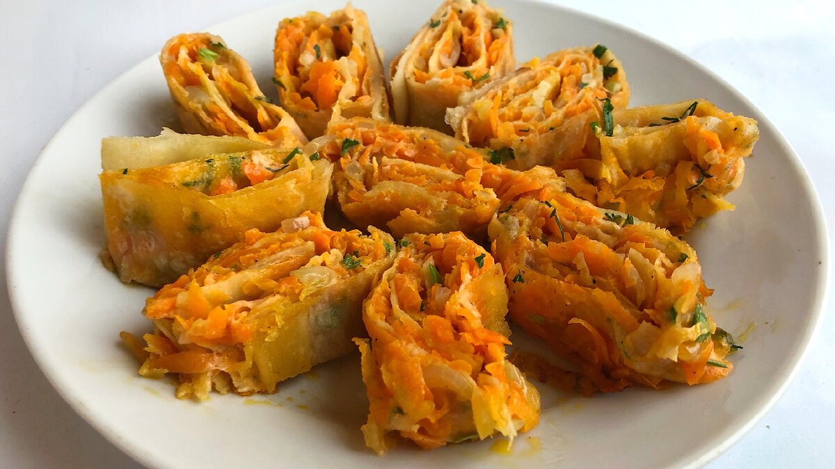 Сегодня предлагаю приготовить закуску из лаваша. Это самый бюджетный вариант какой только можно придумать, но как вкусно. Особенно актуально сейчас, когда не все имеют возможность баловать себя изысками. Спасибо всем кто делится моими рецептами в соцсетях. Для тех кто любит кино, видео-рецепт ниже Давайте готовить. Первое что делаю, шинкую мелкой соломкой лук. Морковь натираю на крупной терке. Наливаю на сковороду подсолнечное масло выкладываю лук и морковь, нагрев убавляю, периодически помешивая обжариваю до готовности, можно добавить 1-2 столовых ложки воды, чтобы овощи не пригорели. Готовый лук и морковь убираю остывать. Можно посмотреть Видео-рецепт или дочитать пост до конца, там еще есть интересный видео-рецепт Пока они остывают делаю соус. Кладу сметану, томатную пасту, чеснок, мелко нарезанную зелень, у меня лук, укроп, петрушка, солю, перчу все перемешиваю. Беру лаваш, разрезаю его на прямоугольники. Смазываю соусом, выкладываю лук с морковью, сворачиваю его в рулет.