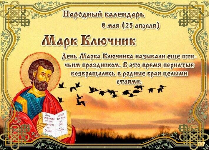 По церковному календарю этот день называют Марков день в честь апостола и евангелиста Марка. Другие народные названия этой даты – Марк и Марк Ключник. По приметам на 8 мая, как обычно, определяли погоду и предсказывали урожай. Издавна в этот день хозяйки вывешивали на улице белье для просушки и обходили все жилье с крапивой, как средством против любого зла, врагов и несчастья. Над входной дверью вешался букет из крапивы, в углах домов раскладывали веточки этого растения, и мылись полы с настоем из крапивы. К Маркову дню ожидался прилет певчих птиц, а чтобы заинтересовать пернатых и привлечь их в свой двор, на земле крестьянки разбрасывали в качестве угощения зерна конопли. Апостол Марк получил свое название «ключник» за то, что, по поверьям, в его руках находятся ключи от дождей – небесной влаги. Поэтому молитвы христиан были наполнены просьбами послать на землю сильный дождь, очень необходимый в это время для посевов. Что касается погодных условий, в этот день обращали внимание на с
