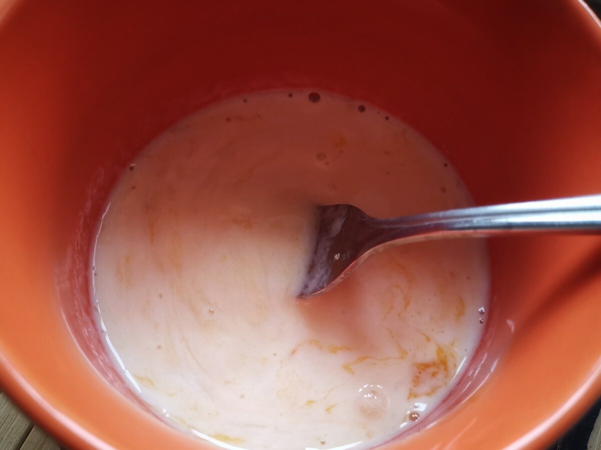 Разбиваю в миску одно яйцо, наливаю примерно 2 столовые ложки кефира.