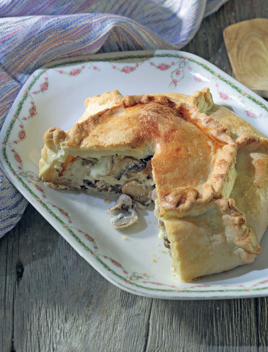 КУРНИК – БОЛЬШОЙ, «ПАРАДНЫЙ» ПИРОГ, УКРАШЕНИЕ ПРАЗДНИЧНОГО СТОЛА. НА САМОМ ДЕЛЕ, ЭТО ОТЛИЧНЫЙ СПОСОБ НАКОРМИТЬ ЦЕЛУЮ КОМПАНИЮ ОДНОЙ КУРИЦЕЙ. ПОСМОТРИТЕ, КАК ПОХОЖ РУССКИЙ КУРНИК НА ТРАДИЦИОННЫЕ АНГЛИЙСКИЕ ПИРОГИ С КУРИЦЕЙ. НИЧЕГО УДИВИТЕЛЬНОГО: ИДЕЯ ТА ЖЕ, ИСПОЛНЕНИЕ – В ЗАВИСИМОСТИ ОТ ХАРАКТЕРНЫХ И ДОСТУПНЫХ ПРОДУКТОВ. Для теста 200 г сливочного масла 500 г пшеничной муки 1 ч. л. соли 300 г сметаны жирностью 15‒20% Для начинки 1 курица весом 1 кг 3 яйца 5‒7 побегов зеленого лука 3‒4 ст. л. топленого масла 350 г некрупных шампиньонов 100‒150 г крошек черного хлеба соль и молотый черный перец по вкусу Для белого соуса 500 мл куриного бульона 30 г сливочного масла 50 г муки 100 г сметаны жирностью 15‒20% соль и молотый черный перец по вкусу Для смазывания 1 яйцо СПОСОБ ПРИГОТОВЛЕНИЯ 1. Для начинки курицу отварите в небольшом количестве воды с добавлением лука и кореньев. Готовую курицу остудите, снимите мясо с костей, удалите кожу. Мясо нарежьте небольшими кусочками. Бульон процедите.