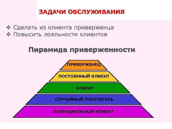 Это предоставление услуги а также удовлетворение потребностей клиентов. Сервис обслуживания это деятельность исполнительной при непосредственном контакте с потребителем услуги или продуктов. Роль сервиса. Интересные факты: Приобретение новых клиентов стоит в 5 раз больше чем удержание существующих, Клиенты, которые не ценят ваш сервис, голосует своими ногами, Клиенты заплатят больше за лучший сервис. Конкурентоспособность на рынках. Сервис является основным фактором для принятия решения.У вас не будет второго шанса произвести первое впечатление-75% возможных клиентов теряется на стадии получения первичной информации. 30% всех покупателей приходит в магазин по рекомендациям друзей знакомых. Сейчас я покажу пирамиду приверженности: роль клиентов в бизнесе: Клиент от нас не зависит, наше существование завис