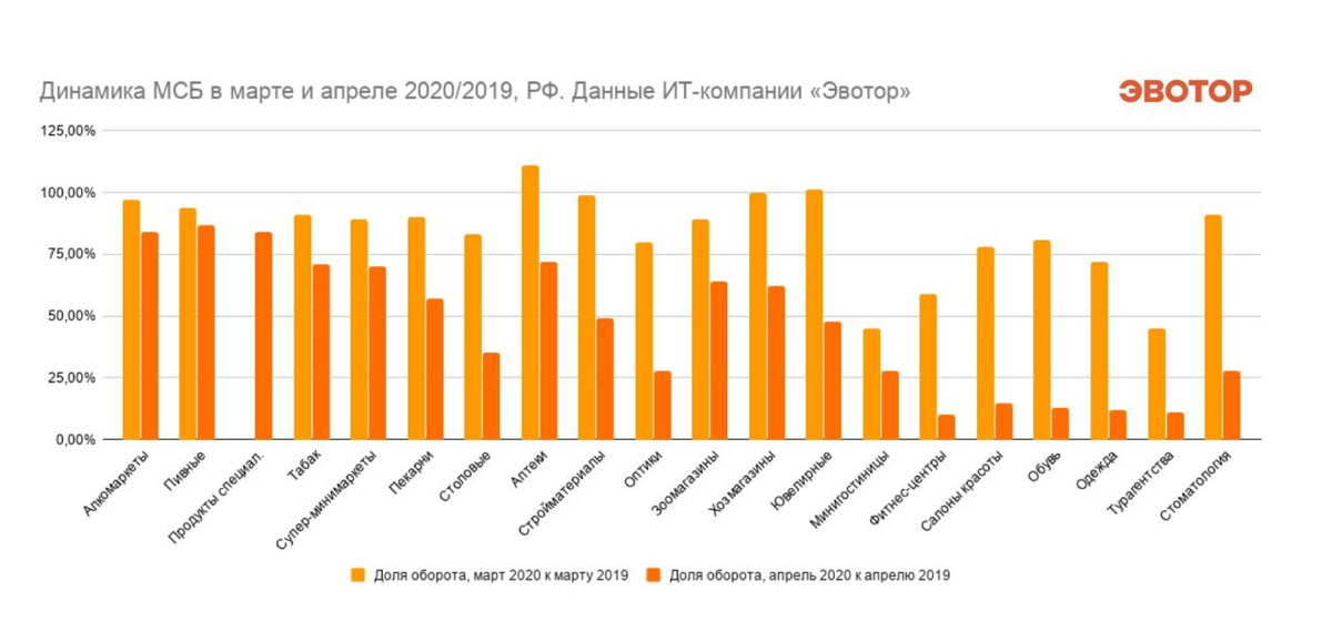 Штампователи кассовых аппаратов из Эвотор собрали свою собственную статистику на основе данных 650 000 устройств. Говорят, что по итогам апреля 2020 года оборот малого и среднего бизнеса показал хлопок отрицательного роста на 54% по сравнению с таким же апрелем, но 2019 года. Сильнее всего сбавили обороты: • Фитнес-центры - 90% • Магазины одежды- 88% • Обувщики - 87% • Салоны красоты и прочие бородобреи - 85% Коронавирус - прилетело практически всем.