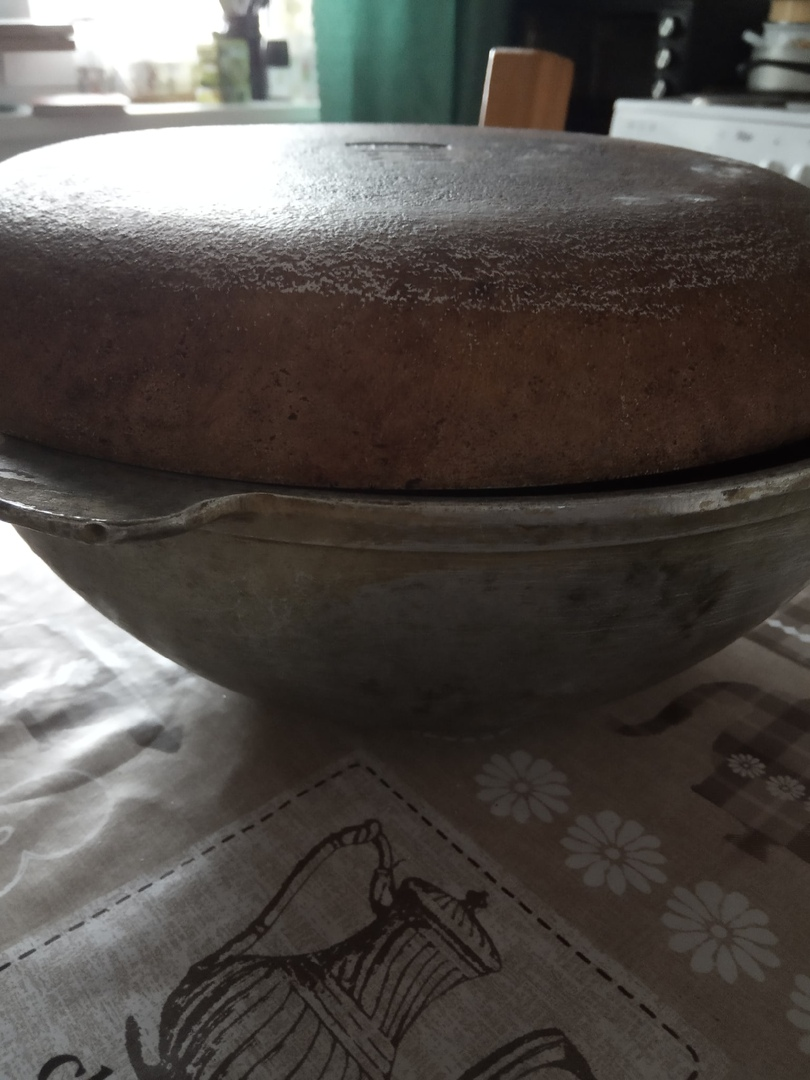Искусство печь хлеб всегда передавалось из поколения в поколение. Секреты никому не рассказывались и первоначальный рецепт сохранялся неизменным. Я буду делиться наиболее удачными рецептами! Тот, кто пробовал печь хлеб знает, что хороший рецепт очень важен. Еще важно знать маленькие секреты, благодаря которым получается ароматный хлеб с упругим мякишем. Рецепт, которым я сегодня поделюсь очень легкий, но требует времени для расстойки теста. Для начала нужно подготовить посуду. Этот хлеб печется в чугунной кастрюле или казане. Можно взять толстостенную кастрюлю, которая выдержит высокую температуру. Если вы найдете, что-то подобное смело можно начинать готовить тесто. У меня старый казан, ценой в три рубля, и такая же старая сковородка без ручки. Ингредиенты: · 390 мл теплой воды · 0,5 чайной ложки сухих дрожжей или 5 гр прессованных · 1 чайная ложка соли · 500 гр белой муки 1. Растворяем дрожжи в теплой воде, всыпаем соль и муку. Ложной объединяем компоненты, получается густое тесто