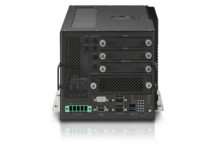 Встраиваемый безвентиляторный компьютер с Intel Core i7-9700TE 1.8ГГц (Max 3.8ГГц), 8Гб DDR4 SO-DIMM, HDMI v1.4, 1xVGA, 8-LAN PoE (опционально), 4xCOM, 3x2.5 SATA, CFast, 2xFull-size mPCIe, 1xPCIe x16, 2xPCIe x4, 6xUSB, DIO, CAN, GPS, Audio, питание 9-36 В DC
