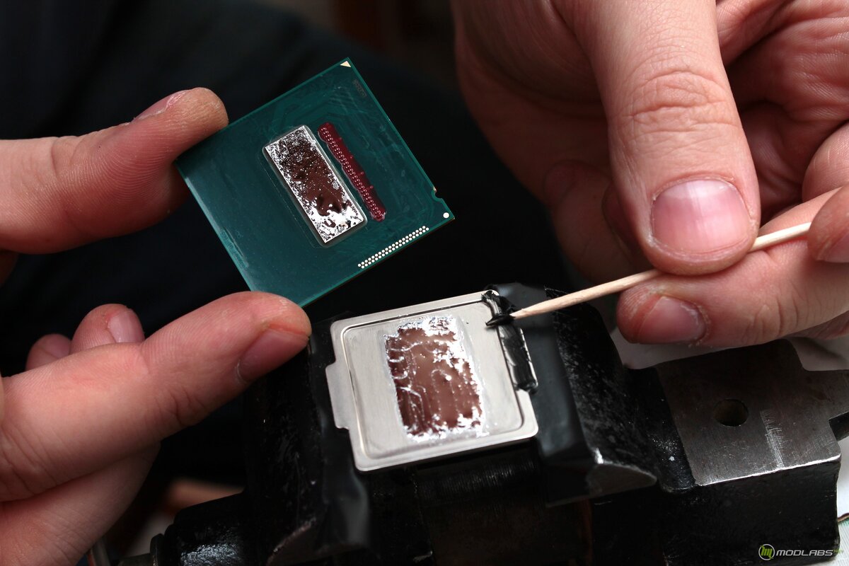 Жидкий металл стал совершенно новым видом термоинтерфейса. Этот материал не затвердевает при комнатной температуре и показывает близкие к припою параметры теплопроводности. Он не засыхает со временем, что дает ему преимущество перед термопастой. На практике, процедура позволяет снизить температуру ЦПУ на 10-20 °C, что играет важную роль при разгоне.