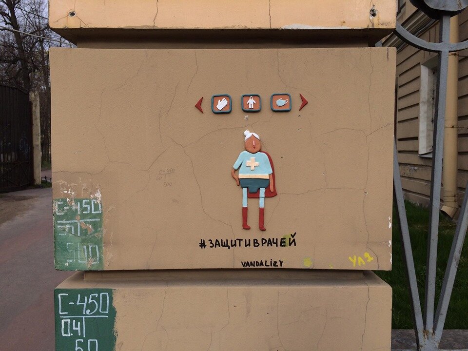 Пожалуйста, оставайтесь дома – вместо вас на улицу уже вышли медики. На фасадах в центре Петербурга появились глиняные фигурки докторов. Забавные барельефы, созданные художницей @vandalizy, призывают горожан оставаться дома в период пандемии коронавируса, чтобы облегчить работу врачей. 6 мая Бэнкси представил свою новую картину – она появилась в больнице английского города Саутгемптон. На ней изображен ребенок, держащий в руках игрушечную медсестру в образе супермена. «Правила игры меняются» – написал на своей странице художник. Британия находится на четвертом месте в мире по количеству заболевших коронавирусом, при этом Россия значительно обгоняет ее по числу ежедневных диагнозов. Главные герои нашего времени – врачи. Они работают без выходных, круглосуточно спасают жизни людей, при этом подвергают самих себя серьезной опасности. Более того, зачастую врачам не хватает элементарных средств защиты – масок, перчаток, бахил. Благотворительные фонды, общественные деятели, представители би