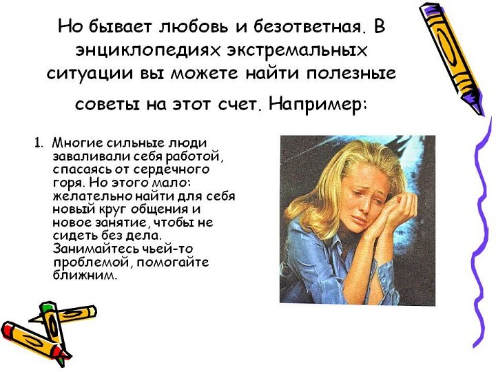 - 2. Отвлекитесь. Активная деятельность отлично помогает избавиться от душевных терзаний. С помощью прогулок с друзьями, работы и интересного хобби вы и не заметите, как объект любви уйдет на второй план.