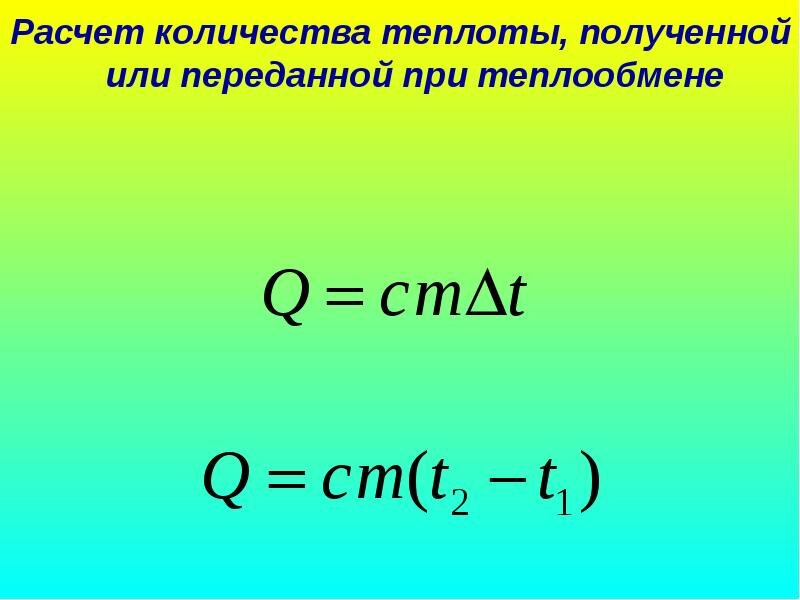 Количество теплоты, затраченной на обогрев тела или выделившейся при его охлаждении, равно произведению удельной теплоёмкости вещества, массы тела и разницы конечной и начальной температур. Формула имеет следующий вид: Q = cmΔT Здесь Q – количество теплоты, c – удельная теплоёмкость вещества, из которого состоит тело, m – масса тела, – ΔT разность температур.