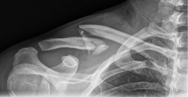 ЧТО ЭТО Рентген ключицы – это 2-х мерный рентгеновский снимок, включающий в себя ключицу, а также грудино-ключичное и ключично-акромиальное сочленения. ДЛЯ ЧЕГО Рентген ключицы назначают при травмах, вывихах, подозрениях на перелом. А так же: КАК ПРОВОДИТСЯ Пациент по возможности раздевается, одевает защитный жилет и снимает металлические украшения. Снимок проводится лежа, иногда стоя, когда лежачее положение вызывает сильную боль. В зависимости от характера травмы, снимок проводится в различных проекциях, лежа на спине, на животе, в косой проекции. ЧТО ВИДНО Рентгенография ключичной кости позволяет визуализировать костную ткань. Нередко проводят профилактический рентген здоровой ключицы, который позволяет выявить заболевания плечевого пояса на ранней стадии развития. Такой подход рекомендуют пациентам, которые регулярно подвергаются физическим нагрузкам: ПОДГОТОВКА Предварительной подготовки к исследованию нет. При недостаточности информации на исследовании, лечащий вр