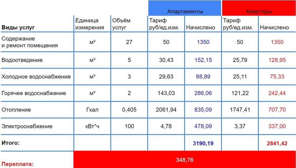 МИФ Большие коммунальные платежи. ПРАВДА Да, они выше по сравнению с квартирами, но только на 18%. Коммунальные платежи на квартиры-студии: Коммунальные платежи на 1-комнатные апартаменты: Коммунальные платежи на 2-комнатные апартаменты: Наиболее важные экономические отличия апартаментов от квартир—это разница в налоговых и коммунальных платежах. Однако элементарные расчёты доказывают, что разница в стоимости апартаментов и квартир показывают повышенные расходы на коммунальные услуги на годы вперед.
