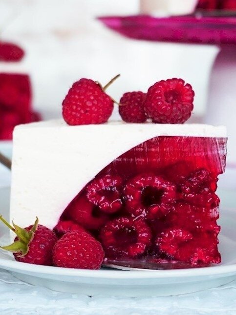 На лист бумажного полотенца, добавить несколько капель масла и смазать тщательно подготовленную форму (слой масла, должен быть очень тонким) в миску положить малину и залить остывшим желе. Чашу покрыть полиэтиленовой пленкой и поставить в холодильник на 2 часа.