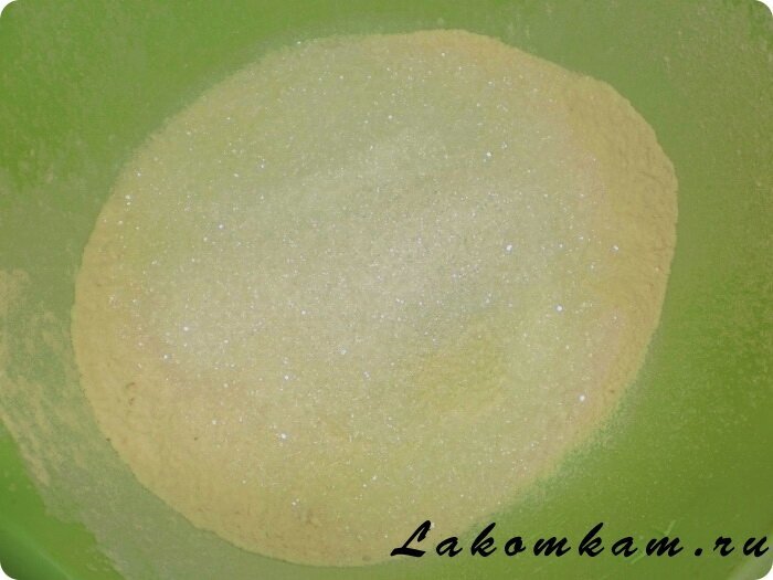 Приготовление печенья «Минутка» баз маргарина. В глубокую миску просеиваем муку, смешиваем с сахаром и разрыхлителем.