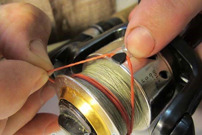 Новичкам лучше использовать одну удочку. Пока техника забросов не отточена, важно постоянно тренироваться попадать в одну и ту же точку. Всегда нужно помнить, что успех в фидерной рыбалке приходит к тому, кто умеет забрасывать снасть с точностью до 0,5 метров. К такому показателю приходят с опытом. После того, как мы нашли место, фиксируем дистанцию ловли методом клипсования шнура на шпуле. Это можно сделать по-разному: либо вставить леску в клипсу, либо в нужном месте намотать банковскую резинку. На фото указаны способы: