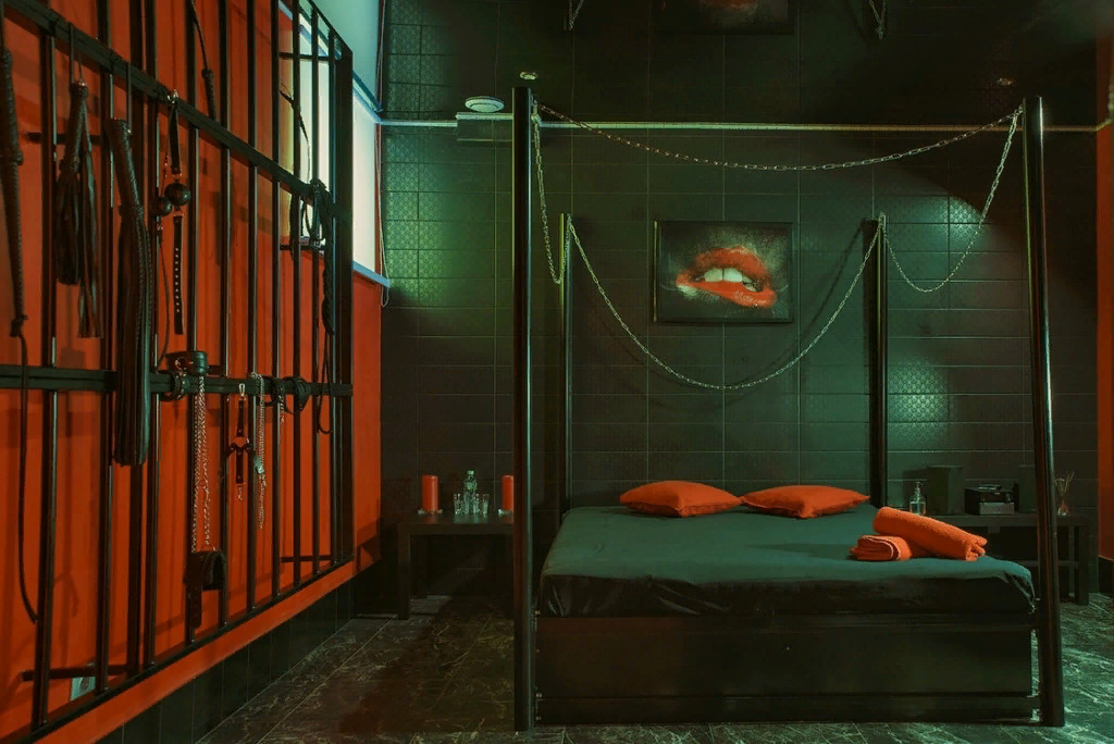 Единственная квартира, где на смену атмосфере неги и романтики приходит жесткая, агрессивная сексуальность. Полумрак распаляет и без того разыгравшееся воображение. Преобладающие в интерьере оттенки красного пробуждают страсть и активизируют сексуальную энергию. А контрастные им черные детали, как, впрочем, и шелк простыней на фоне грубых металлических решеток напоминают о вечном противостоянии внутри этой комнаты: один - властвует, другой - подчиняется. Багровые отсветы будят подавляемые инстинкты, а крепкие столбцы и решетки не дадут рабу убежать далеко от своего наказания! Ролевые игры в подобном месте – мощный источник возбуждения!