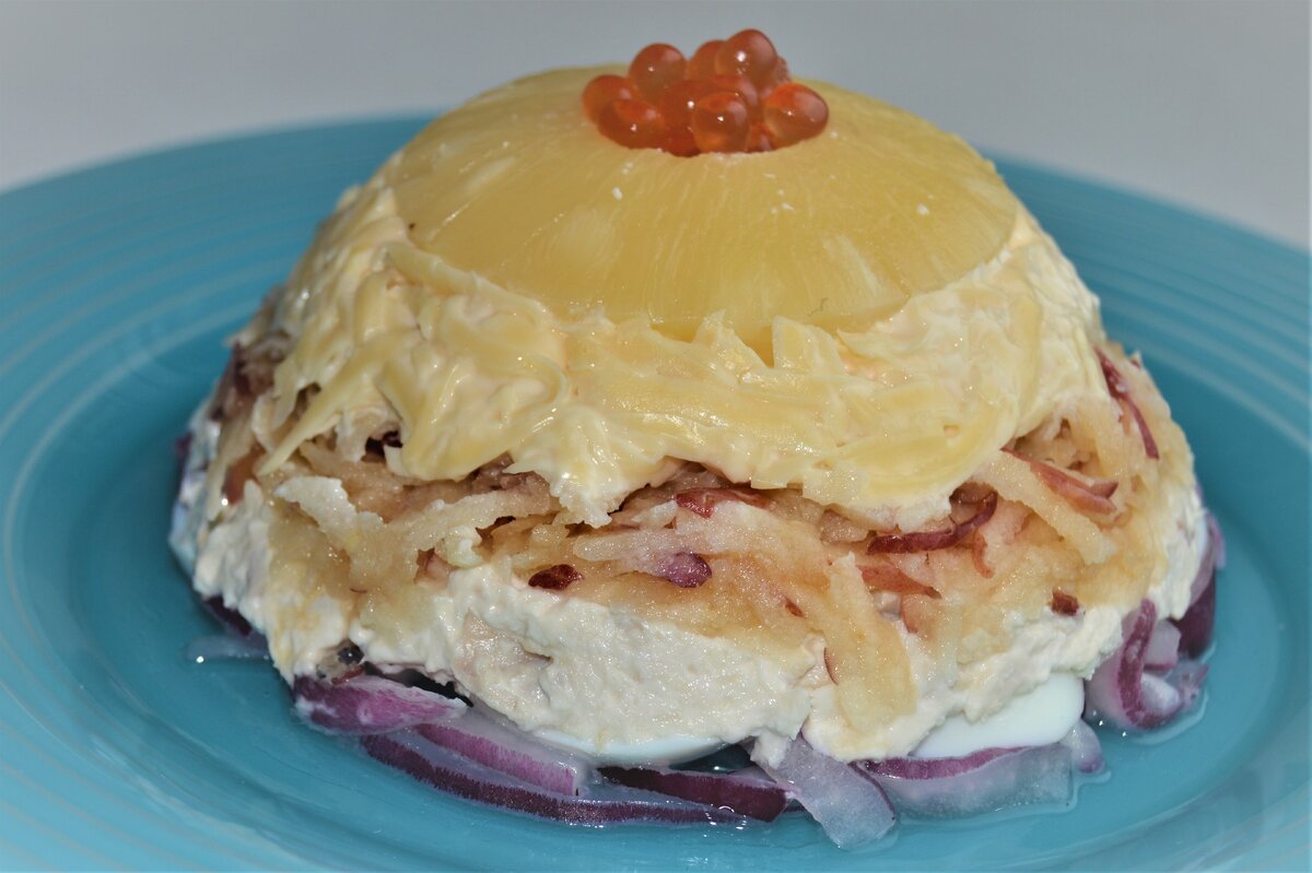Представляю превосходное сочетание простых и доступных продуктов, которое запомнится Вам надолго. Праздничный салат побалует своим великолепным вкусом и наверняка станет одним из самых желанных на столе. Этот рецепт дополнен удивительным продуктом, который придаст ему гармоничный привкус. (Красная икра - лишь для украшения и совершенно не обязательна) Салат очень прост в приготовлении и нам потребуется (для 6 персон): филе любой птицы - 400 гр, яйца куриные - 5 шт, сыр - 200 гр, два яблока, луковица, майонез и немного... консервированного ананаса! Филе и яйца отвариваем, остужаем. Лук маринуем. Для укладки салата применяем глубокую посуду. На заставке приведена порция на одну персону. Для семьи - выбираем глубокое блюдо немного большего размера и укладываем ПЕРВЫМ слоем маринованный лук: Добавляем в лук с чайную ложку майонеза и перемешиваем. ВТОРЫМ слоем укладываем тёртый сыр, добавляем майонез: ТРЕТЬИМ слоем - крупно нарезанные яйца: ЧЕТВЁРТЫМ слоем укладываем мелко нарезанное ф