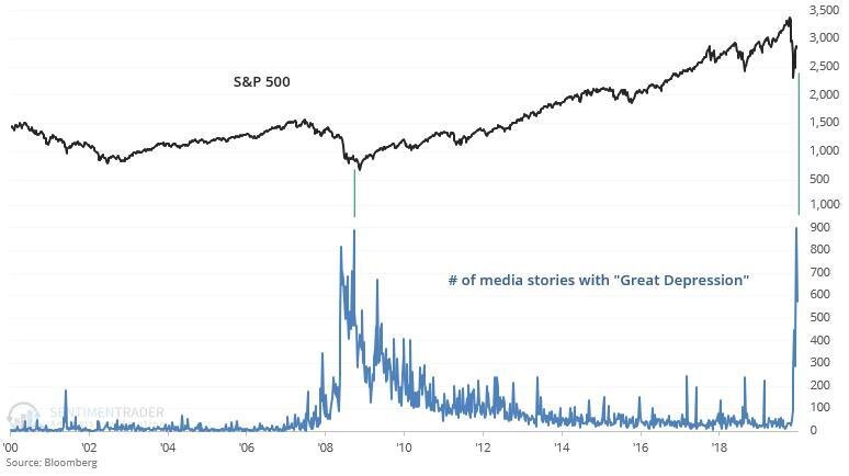 Есть такое понятие, как сентимент, или, иначе говоря, настроения. Настроения не возникают просто так, их формируют при помощи СМИ, социальных сетей и т.д. На данный момент мы живем в интересное время, когда очень просто вложить людям в голову то, что нужно именно тебе. Особенно, когда ты владеешь серьезными новостными ресурсами. Почему это сделать очень просто?! Потому что люди любят быть обманутыми. Уже было исследование, подтверждающее, что негативные новости воспринимаются людьми гораздо ярче позитивных, и это заставляет возвращаться к источнику пессимизма (именно поэтому аудитория армагеддонщиков никогда не иссякнет). Так вот, я долго пытался найти то, что сейчас прикреплено к посту ниже. На картинке два графика: 1. Индекс SP500. 2. График упоминания в СМИ о Великой депрессии и сравнения текущей ситуации с тем временем. Проще говоря, мы можем наблюдать, как ведет себя рынок, когда СМИ буквально забиты новостями о том, что все пропало и мы летим в пропасть! И на данный момент вид