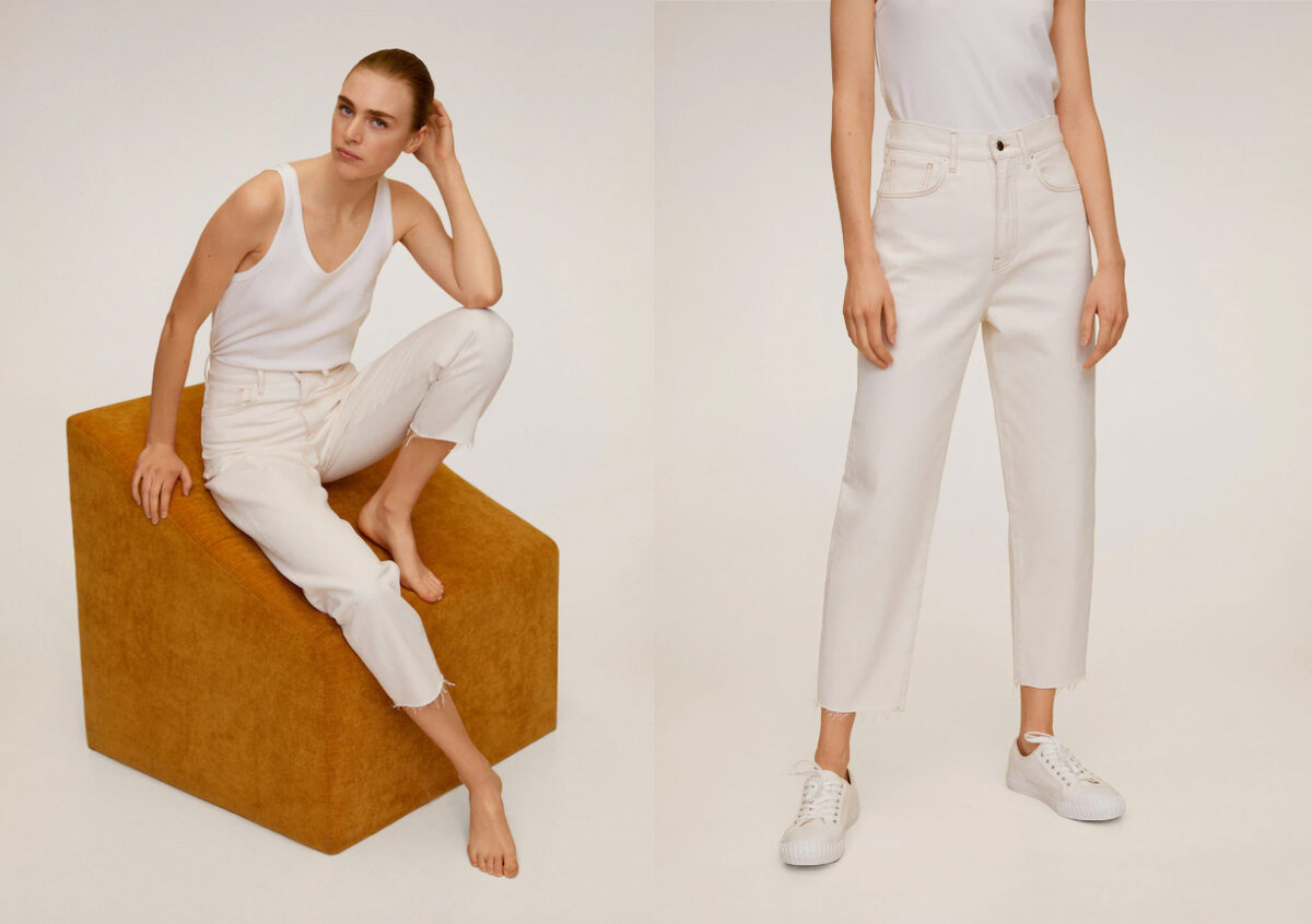 Будем вдохновляться люксовыми образами со светлыми джинсами в главной роли, а их аналоги собирать в масс-маркете. Во всех бюджетных образах участвуют одни и те же светлые джинсы Mango.