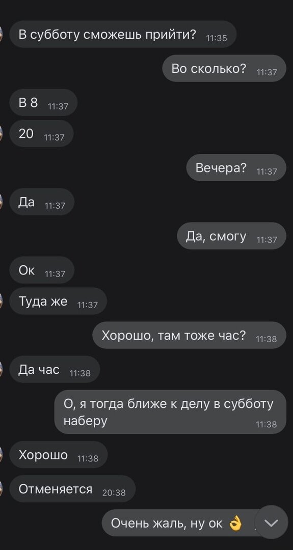 После этого странного 30 секундного разговора я, честно сказать, потерял дар речи. Было совершенно непонятно что снимать, кого снимать, сколько будет человек, за какую стоимость и ещё куча разных вопросов. Конечно же я потом дозвонился клиенту, но ситуация очень странная. После этого мы ещё несколько раз пытались работать, наша переписка выглядела таким образом: