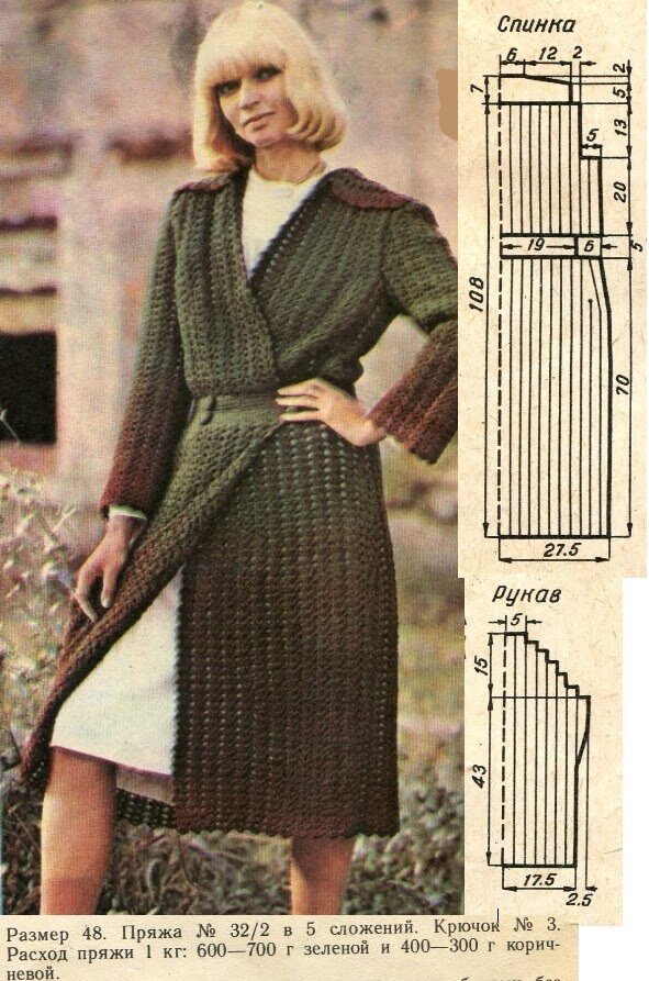Добрый день, читатели. Продолжу рассказ об увлекательных моделях журнала “Вязание” за 1985 год, автор Л.С. Усс. Сегодня начинаем с пальто, связанного ажурным узором. Информационные данные на фото. Кокетки спинки и полочек вяжем столбиками без накида. Для совпадения рисунка обеих плеч скосы выполняем по схемам. ОН - оборвать нить. НН - новая нить. НВ - начало вязания. По краю кокетки полочки разместите 7 рисунков узора и вяжите без изменения прямую часть проймы. Прибавьте один рисунок в середине полотна. Эту операцию выполняем так. Под воздушные петли 7-го рисунка, считая от борта, вяжем группу: 3 столбика с накидом, 3 воздушные петли, 3 столбика с накидом, 3 воздушные петли, 3 столбика с накидом. Увеличиваем пройму на 3 рисунка узора, набирая воздушные петли у края полотна. В следующем ряду под каждую из 2-х цепочек в группе прибавки провяжите по целому рисунку. Через 2-3 ряда в середине полотна прибавьте еще один рисунок узора. До талии вяжем без изменений. Аналогично вяжем втору