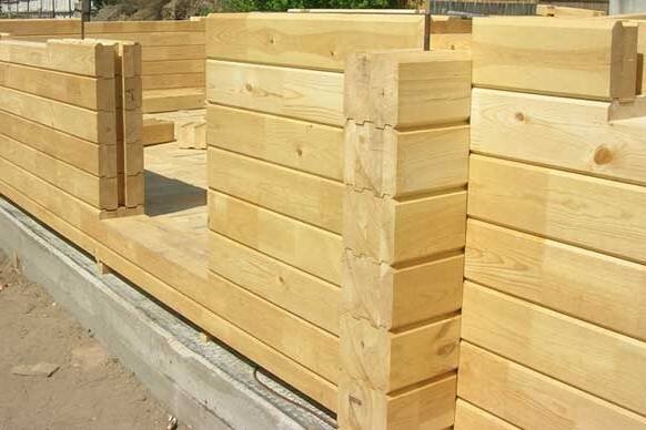 Возведение стен из бруса начинают без предварительной сборки, сборку начинают сразу на месте строительства дома или бани, в отличии от возведения стен из бревен. Для строительства из бруса используют два основных способа угловых соединений – «в угол» и «с остатком». Межвенцовые соединения делают с помощью деревянных нагелей в форме круга с диаметром три сантиметра.
