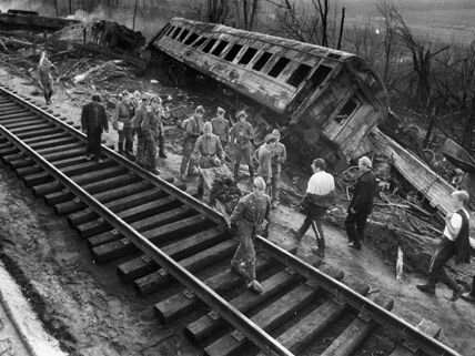 Составы почти разминулись когда произошел сильнейший взрыв. Смятые как бумага вагоны разметало по насыпи.