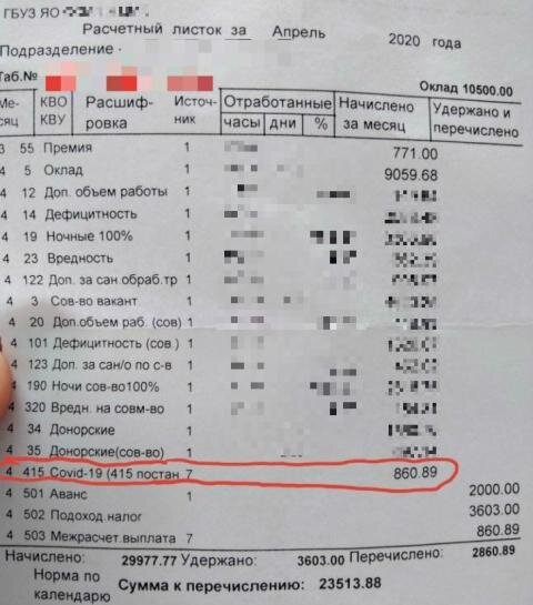Медицинский персонал из Ярославля рассказали, какие доплаты они получили за работу с больными COVID-19. Многие из персонала дополнительных денег так и не увидели. Свои расчетные листочки они показали журналистам издания 76.ru. — За апрель дали фельдшерам, которые ездили по коронавирусу: кому 700 рублей, кому 900. Диспетчерам, которые принимают вызовы, по 3000. Чтобы получить надбавку, надо целый месяц отработать на инфекционной бригаде. Но это сделать нереально, потому что постоянно всех пересаживают, — рассказал 76.RU работник скорой. — Нам сказали, что учет выездов за апрель не велся, а чтобы получить доплату, нужно полный месяц отработать. Кто-то в итоге ушёл на больничные со словами: «Ну на фиг, за бесплатно рисковать никто не будет». А водители скорой не получили ничего. По указу Правительства России от 2 апреля 2020 года и указу президента страны медикам положено сразу две выплаты: первая — за дополнительную нагрузку в период коронавируса, вторая — тем, кто непосредствен