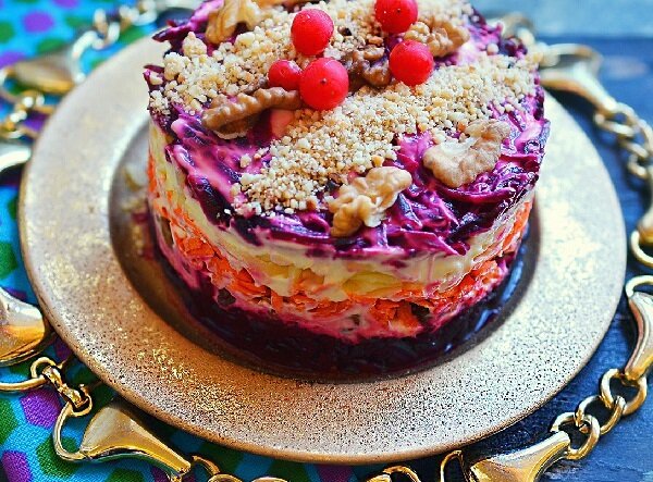 - Покрыть салат майонезом и оставшимися нарезанными грецкими орехами.