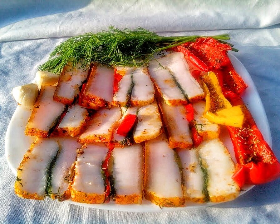 Сало с болгарским перцем и чесноком "по-домашнему". У меня его едят даже те, кто сало не любит