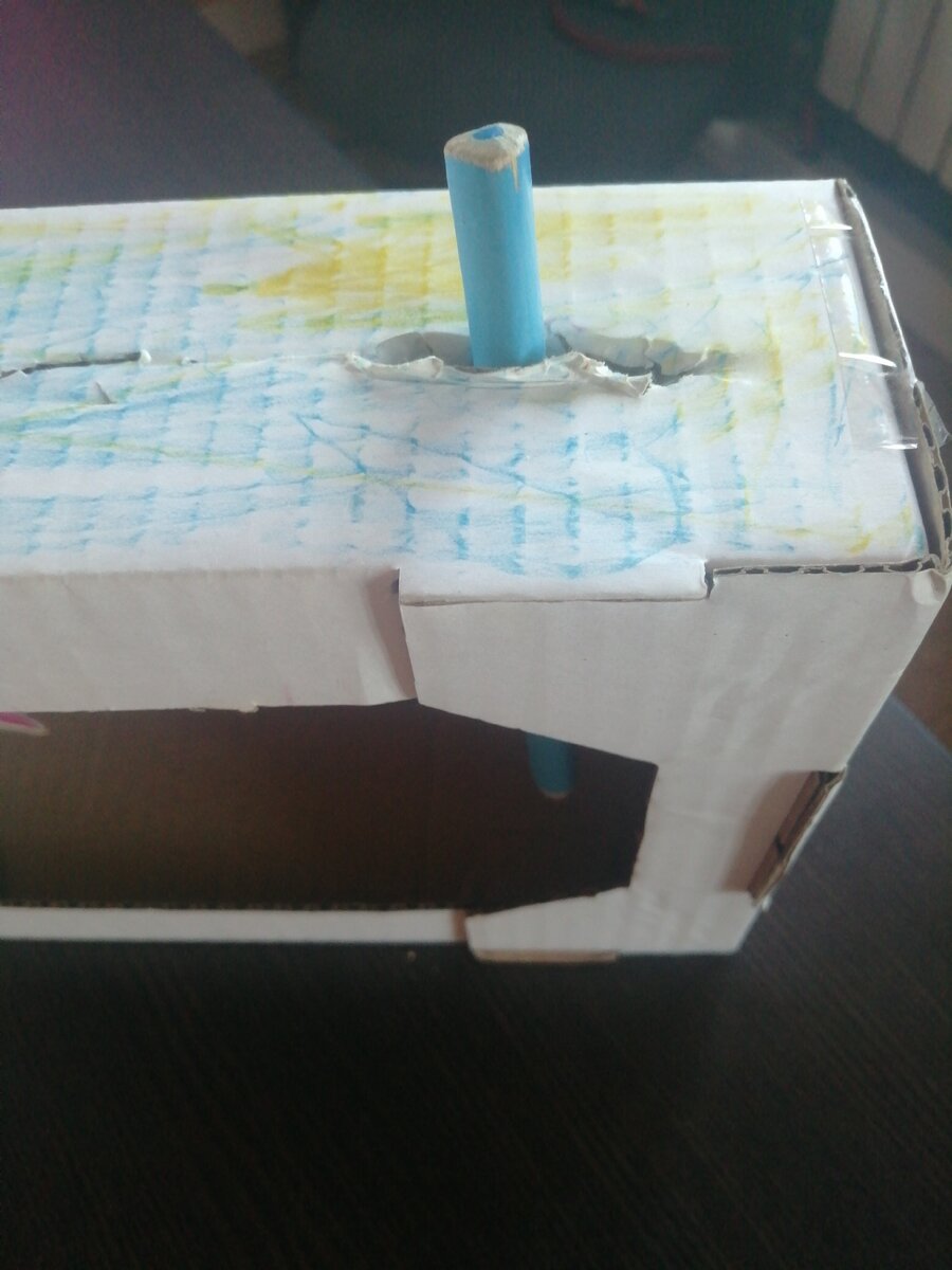 Всем отличного настроения! Мирного неба над головой. Сегодня мы приехали на дачу. Съели печенье. Нашли старый журнал. Детям стало скучно. Нужна новая игра. Куда же я поеду в карантин? Правильно. Никуда. Будем делать игру Кукольный театр из мусора. Игрушку я отвоевала, чтобы вам показать во время дневного сна. Она уже не много обтрепалась. Вам понадобится: 1. коробка из под печенья, 2. 2 карандаша, 3. 2 персонажа (их можно вырезать из журнала или упаковки из под детских продуктов), 4. Скотч или изолента, 5. Занавес (ткань или как у меня пупырчатая пленка), 6. Нитка с иголкой В верху коробки проделываем отверстия и вставляем карандаши. Делаем прорези, чтобы карандаш двигался вперед и назад. На карандаш приклеиваем персонажей. Дети маленькие. И постоянно карандаши вытаскивали вместе с персонажами. Поэтому бедный наш теленок пострадал. Делаем занавес. У меня в качестве него выступила пупырчатая пленка. Она попалась мне под руку. Продергиваем нитку и оставляем концы нитки, которые прикреп