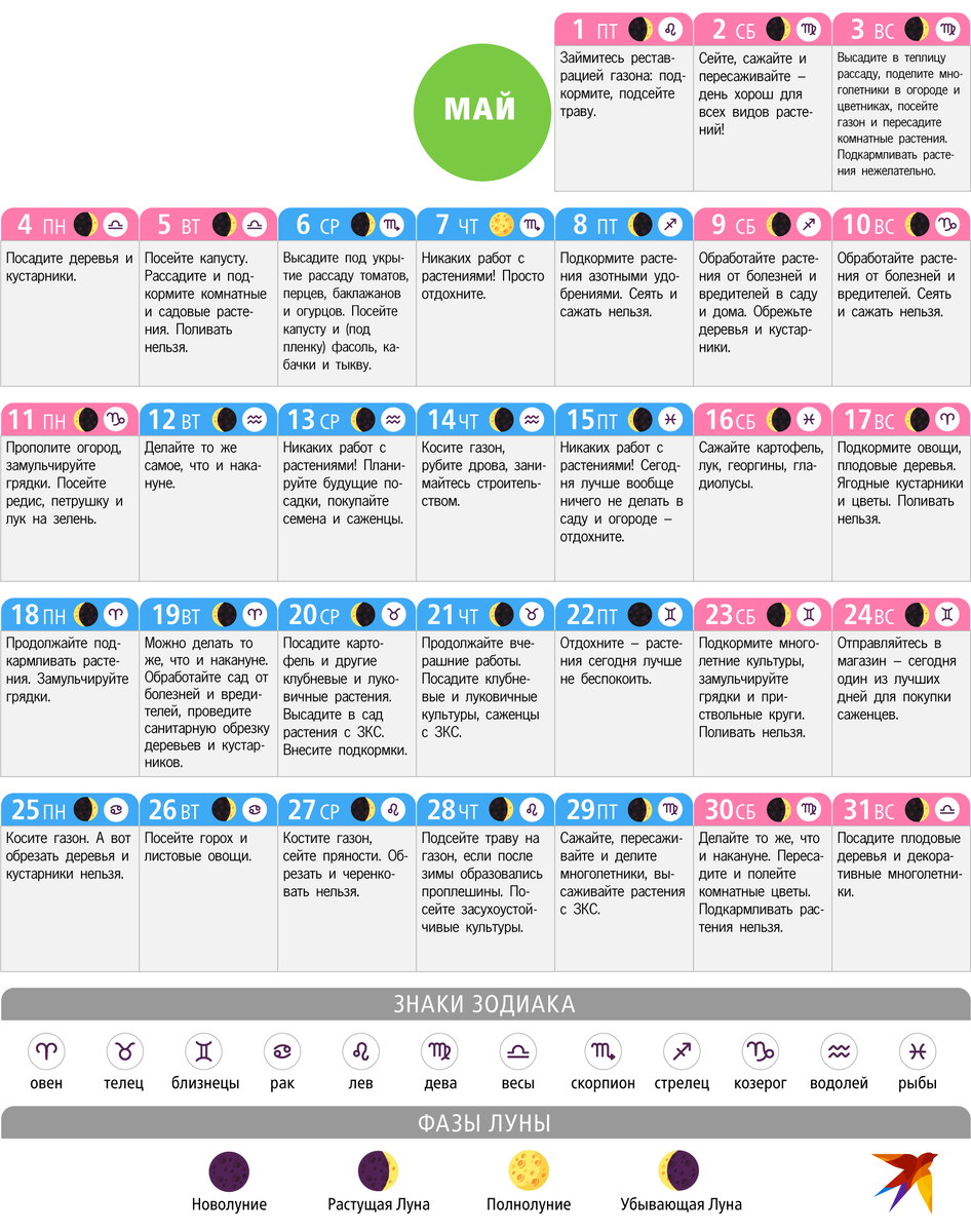 Май - травень, травник. Главный месяц для садоводов и огородников, потому что именно в мае закладывается хороший урожай. Рассказываем как продуктивно засевать огород, используя лунный календарь в 2020 году Весенний день год кормит – без сомнения, эта пословица про жаркие майские деньки. И недаром в народе май зовут травень – все распускается, цветет и радует глаз. Начиная с первых майских дней и заканчивая последними весенними днями, садоводы все время что-то сажают, рыхлят, поливают, подкармливают – весной все растения нуждаются в азотном удобрении для быстрого дружного роста. Активизируются вредители и болезни – нужно вовремя замечать их проявления. На место съеденной зелени, в том числе и редиса, нужно вовремя подсевать замену, чтобы летом не остаться без полезных трав и корнеплодов. Приметы мая: