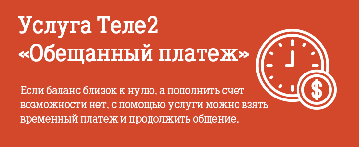 Многие сталкивались с такой ситуацией, когда на счету мобильного телефона нет средств, а надо быть на связи с важными контактами. Что делать, если возможности пополнить баланс попросту нет – удаленность от терминала или проблема с бюджетом? Абоненты Теле2 могут использовать услугу «Обещанный платеж», которая позволяет временно получить в долг для общения сумму денег определенного размера, после чего погасить ее через фиксированное количество дней. Таким образом можно всегда получить поддержку от оператора в сложных ситуациях. Как это сделать? Как брать обещанный платеж на Теле2? Итак, у вас нет денег на балансе, и вы хотите исправить это положение. Взять «Обещанный платеж» на Теле2 очень просто – для этого необходимо воспользоваться командой *122*1# . Но перед этим рекомендуем ознакомиться с условиями и ограничениями услуги. В зависимости от региона пребывания устанавливается разный минимальный срок после истечения которого новым абонентам Теле2 становится доступна услуга «Обещанный п