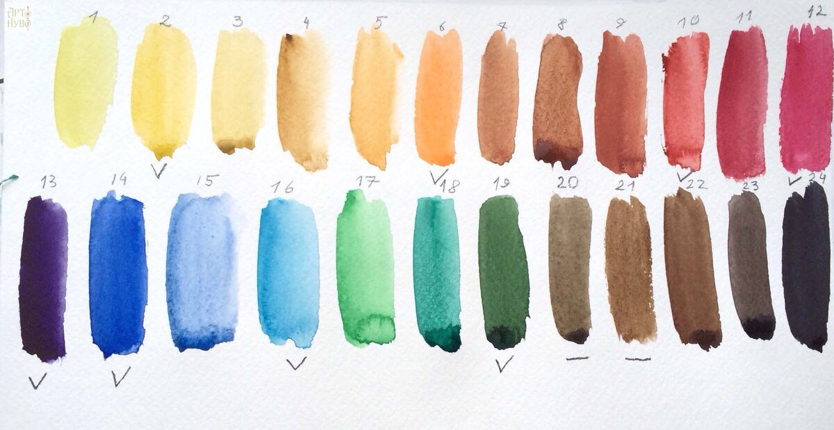Стандартный набор питерских красок, 24 цвета: 01. Кадмий лимонный 203 *** 02. Кадмий желтый средний 201 *** 03. Охра желтая 218 ** 04. Сиена натуральная 405 *** 05. Золотистая 216 ** 06. Кадмий оранжевый 304 *** 07. Охра красная 309 *** 08. Сиена жженая 406 *** 09. Железоокисная светло-красная 321 *** 10. Алая 318 * 11. Краплак красный светлый 313 *** 12. Карминовая 319 *** 13. Фиолетовая (607 *) или фиолетово-розовая 14. Ультрамарин 511 *** 15. Кобальт синий 508 *** 16. Голубая 513 *** (у меня в наборе ярко-голубая, нестандартная) 17. Желто-зеленая 718 *** 18. Изумрудно-зеленая 713 *** 19. Зеленая 725 ** 20. Умбра 418 *** 21. Марс коричневый 412 *** 22. Умбра жженая 408 *** 23. Сепия 413 *** 24. Нейтрально-черная 805 *** Галочкой отмечены необходимые цвета, без которых не обойтись. Минусом отмечены не очень подходящие для больших заливок цвета. *** означают светостойкость краски. Чем больше звездочек, тем краска лучше
