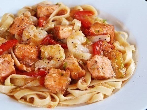 Ингредиенты: Паста фетуччини — 400 г Креветки — 300 г Филе лосося — 2 шт. Желтые помидоры — 6 шт. Красный стручковый перец — 1 шт. Бульон рыбный — 2 стакана Белое вино — 1/2 стакана Петрушка — 1 пучок Сушеный эстрагон — 1 ч. л. Паприка — 2 ч. л. Красный перец — 2 ч. л. Чеснок — 4 зубчика (выдавить) Лук-порей — 2 шт. (мелко нарезать) Молотый перец Соль Сливочное масло — 50 г Оливковое масло Приготовление: 1. Отварите пасту в соответствии с инструкциями на упаковке. 2. В сковороде нагрейте оливковое масло и обжарьте филе лосося, нарезанное кусочками. 3. В эту же сковороду выложите сливочное масло и обжарьте лук и чеснок до готовности. 4. Выложите нарезанные помидоры и готовьте с минуту. 5. Добавьте бульон, эстрагон, паприку, красный перец, белое вино и соль. Доведите до кипения. 6. Выложите красный стручковый перец и креветки и готовьте около минуты. 7. Выложите в сковороду пасту и тщательно перемешайте. 8. Добавьте приготовленный лосось, выключите огонь и присып