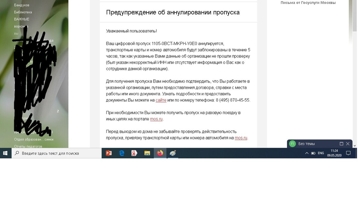 Всех приветствую на своем канале. Ранее я уже писал как я получил пропуск забив все данные сам, а через пять дней мне пришел автоматически новый пропуск. Себе на пропуск я подавал данные еще 31 марта, но автоматический пропуск пришел только 20 апреля, вместо 15 - го. Жене пропуск решил сделать гораздо позже. Зашел через ее Госуслуги на мос.ру забил инн своего работодателя и пришел сразу пропуск. После 30 апреля мы его благополучно продлили. 7 мая вечером я проверил ее пропуск по номеру автомобиля и увидел, что у нее нет разрешения на передвижения. Сразу же решил проверить код на мос.ру и не дома.На мос.ру показывало, что все хорошо, а на не дома показало что пропуск аннулирован. Ближе к ночи пришло письмо на почту об аннулировании пропуска. Основанием для аннуляции пропуска послужило то, что указанные нами данные не прошли проверку. Мой пропуск действует по сей день. Данные на меня и других сотрудников мы передавали в мэрию Москвы 31 марта. На жену же я решил позже забить на сайте в