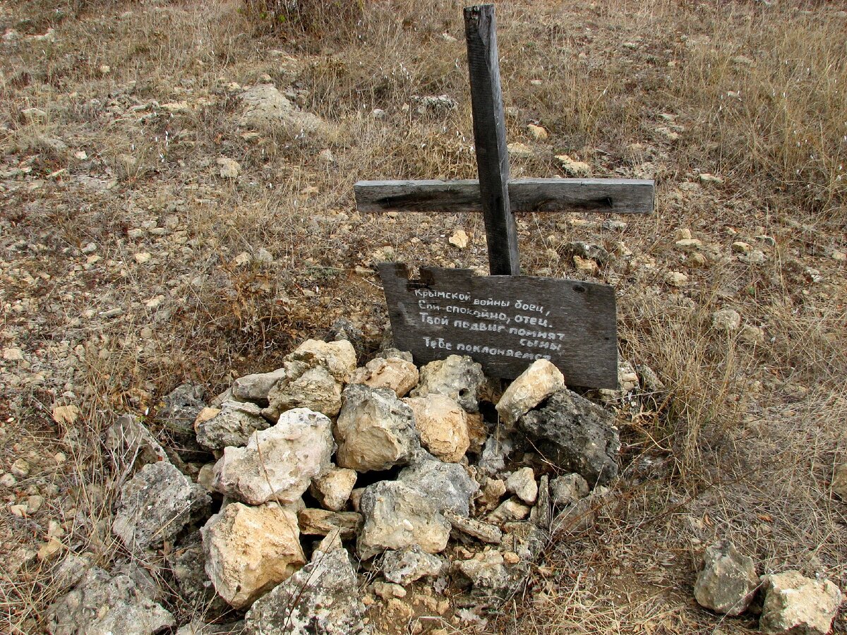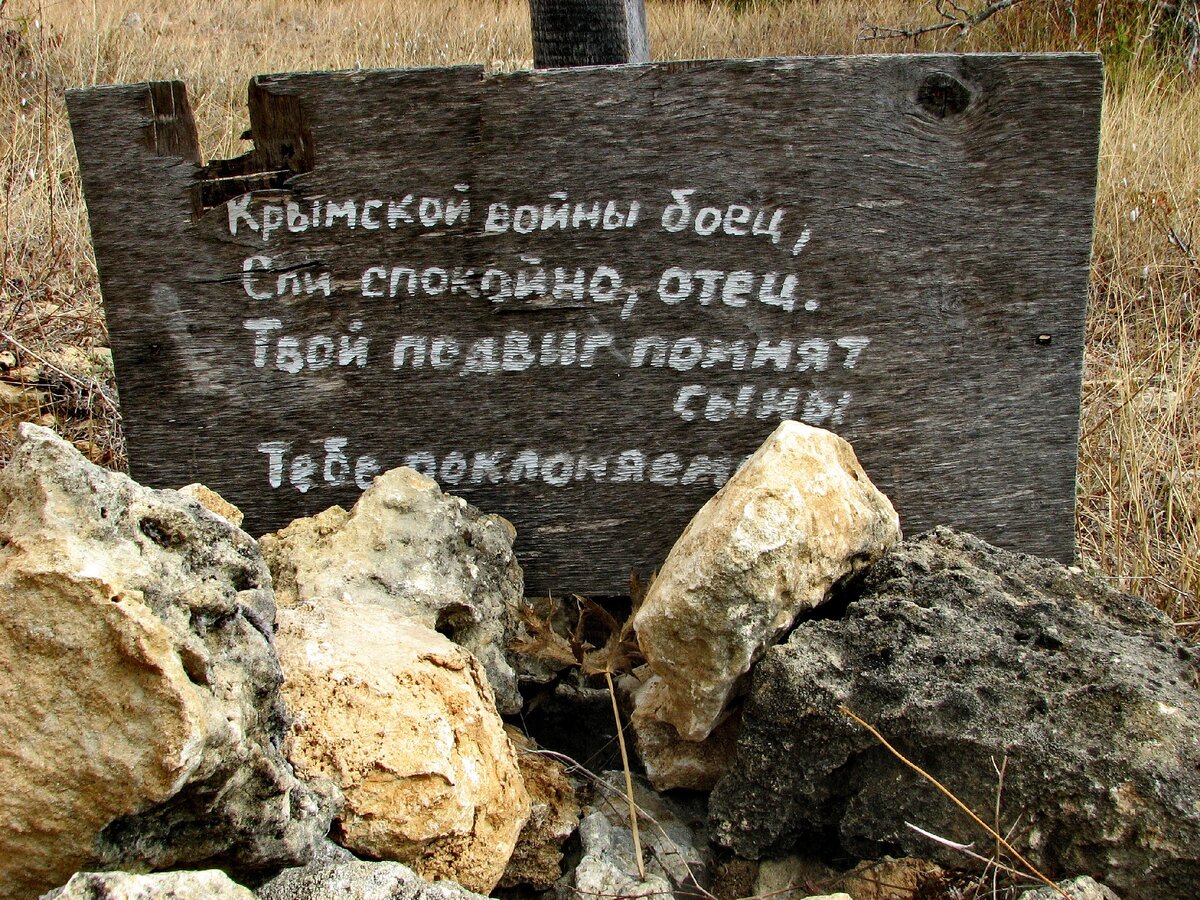 Эти фото сделаны мной 24.09.2016 г, в Севастополе, в районе Горпищенко. Мы отмечали новоселье нашей коллеги, она организовала шашлыки в лесу. Всё было классно, у всех было прекрасное настроение, молодые, счастливые лица... Я немного прошлась по лесу, и увидела вот это. В тот момент меня поразило, что кто-то, найдя останки, сделал такой вот самодельный памятник, поставил крест и написал на фанерке эти пронзительные слова. Поклон этому человеку! Впоследствии, отправила эти фото в общество, занимающееся поиском останков воинов ВОВ. Ждала, что меня спросят координаты этой могилы. Я готова была их предоставить и проехать показать. Но нет, ответа до сих пор нет. Огонь, батарея ! Очень сильный фильм, не пожалейте времени на него ! Прошу прочитать комментарии под видео. В Севастополе, в самом центре, есть ул Адмирала Октябрьского, и недалеко ул Генерала Петрова. Вот так. Крымской войны боец Спи спокойно отец Твой подвиг помнят сыны Тебе поклоняемся мы