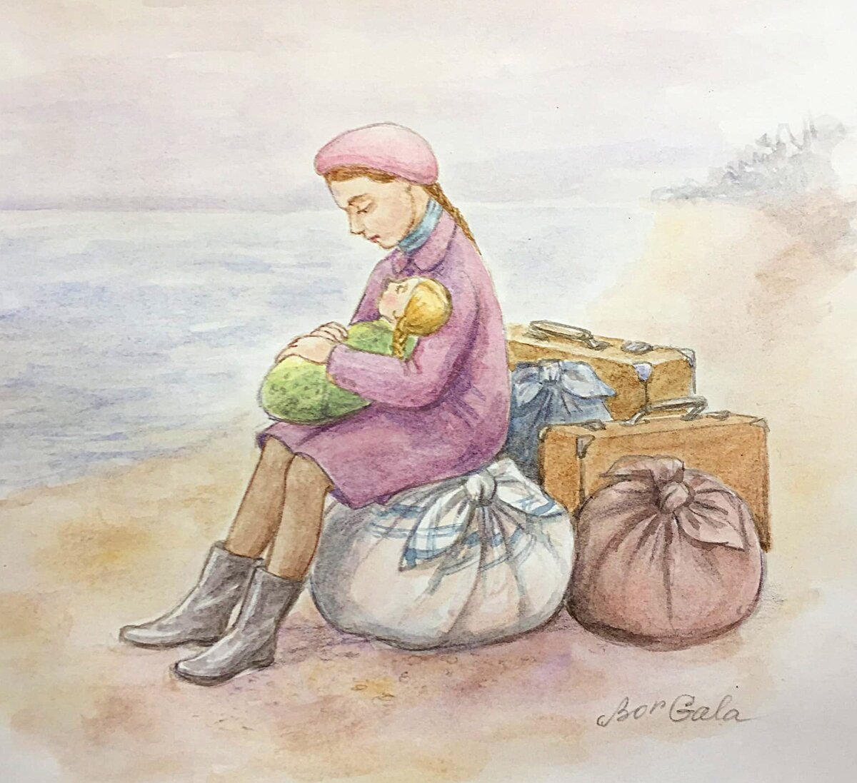 Баржей было несколько, плыли друг за другом, но началась бомбежка, снаряд потопил одну из барж, и все оставшиеся изменили маршрут следования. В результате мама оказалась с вещами на берегу одна. Ладожское озеро огромное, она не видела вокруг ни одного причала. В руках с любимой куклой сидела на узлах, не зная, что ее ждет. Прошло много времени, стало вечереть, она отчаялась, что больше не увидит маму с братом. «А вдруг родные стали жертвами бомбежки?», — страшные мысли посещали ее. И тут она подняла голову и увидела, что они идут по берегу к ней навстречу! Можно представить их радость — семья вместе, это главное!