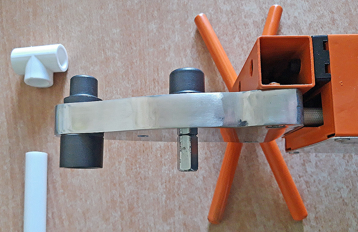Для работы понадобятся: аппарат для сварки пластиковых труб, полипропиленовый тройник и отрезок трубы диаметром 20 мм, удлиненная гайка М8. Устанавливаем насадки для пайки 20 диаметра, а в другое гнездо удлиненную гайку, чтобы она тоже нагрелась (можно использовать болт которым закрепляются насадки сварочного аппарата - у них резьба тоже М8). С помощью аппарата спаиваем тройник с отрезком трубы. Трубу отпиливаем по самый тройник (см 2 фото). В тройник, в место, куда впаяли трубу, впаиваем удлиненную гайку не до конца, чтобы при закручивании гайки потом основная нагрузка шла именно на неё (см 3 фото). Для проверки прочности, затянул сделанной барашковой гайкой седло у велосипеда, седло не опустилось под моим весом, гайка не провернулась и не выпала из тройника! Габариты получившейся барашковой гайки 5 см ширина и высота. Цена вопроса: удлиненная гайка 6 рублей + тройник 5 рублей, и того 11 рублей! Этот способ подойдет и для изготовления барашкового болта, вместо удлиненной гайки в п