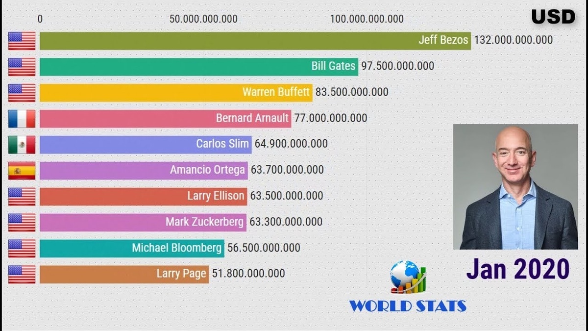 Все здравствуйте,сегодня я выложу рейтинг самых богатых людей мира. Для начала начнем с самого рейтинга: Вот так выглядит рейтинг самых богатых людей мира на январь 2020 год . Вот краткая информация о 10 показанных на рейтинге выше миллиардерах : 1.Jeff Bezos-самый богатый человек в мире,его состояние оценивается в 132 миллиарда долларов,ему 56 лет,родился в штате Нью-Мексико(США),источник его богатства компания "Amazon"(торговая площадка). 2.Bill Gates-состояние оценивается в 97 с половиной миллиардов долларов,возраст:64 года,место рождения: Сиэтл , США ,источник богатства:Microsoft(компания выпускающая компьютерные детали и программные обеспечения). 3.Warren Buffett-состояние оценивается в 83 с половиной миллиарда долларов,возраст:89 лет,место рождения:Омаха,США,источник богатства:инвестиции. 4.Bernard Arnault-состояние оценивается в 77 миллиардов долларов,возраст:71 год,место рождения:Рубе,Франция,источник богатства:LVMH( транснациональный холдинг ).