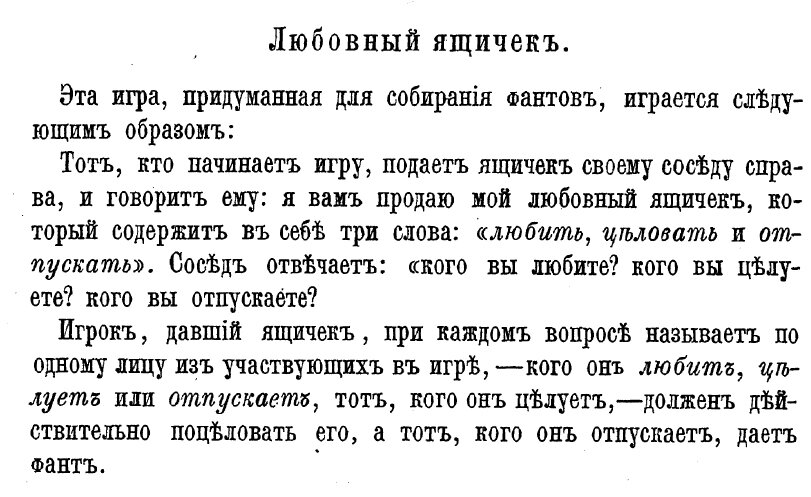 Ниже на фото страницы объяснение условий сумбурное, попробуем догадаться. Итак, первый игрок «продает» соседу символический «любовный ящик». В качестве платы сосед спрашивает: «Кого вы любите? Кого целуете? Кого отпускаете?».