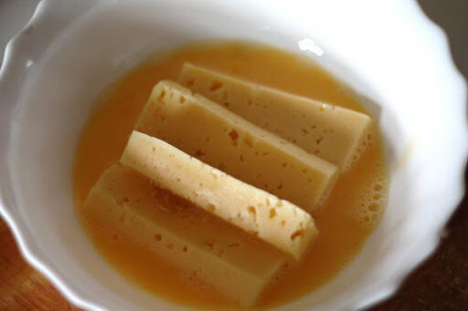 Яйцо взболтать, добавить перец, щепотку соли. Сыр нарезать толстыми брусочками. Обмакнуть во взбитое яйцо Затем в муке, а потом в сухарях. В панировочные сухари можно добавить сушеный тимьян. Обжарить на масле до румяной корочки со всех сторон (масла налить немного). Горячий сыр сразу же подавать к столу. Очень вкусно с ягодным соусом Приятного аппетита!