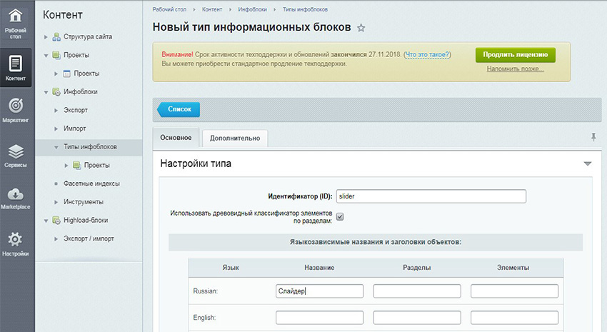 Итак для начала создаем новый тип инфоблока и сам инфоблок в админ-панели битрикса. Тип инфоблока это своего рода папка для самих инфоблоков. А инфоблок — таблица, где будет храниться список с элементами, в данном случае это слайды. Тип инфоблока cлайдер и его ID slider.