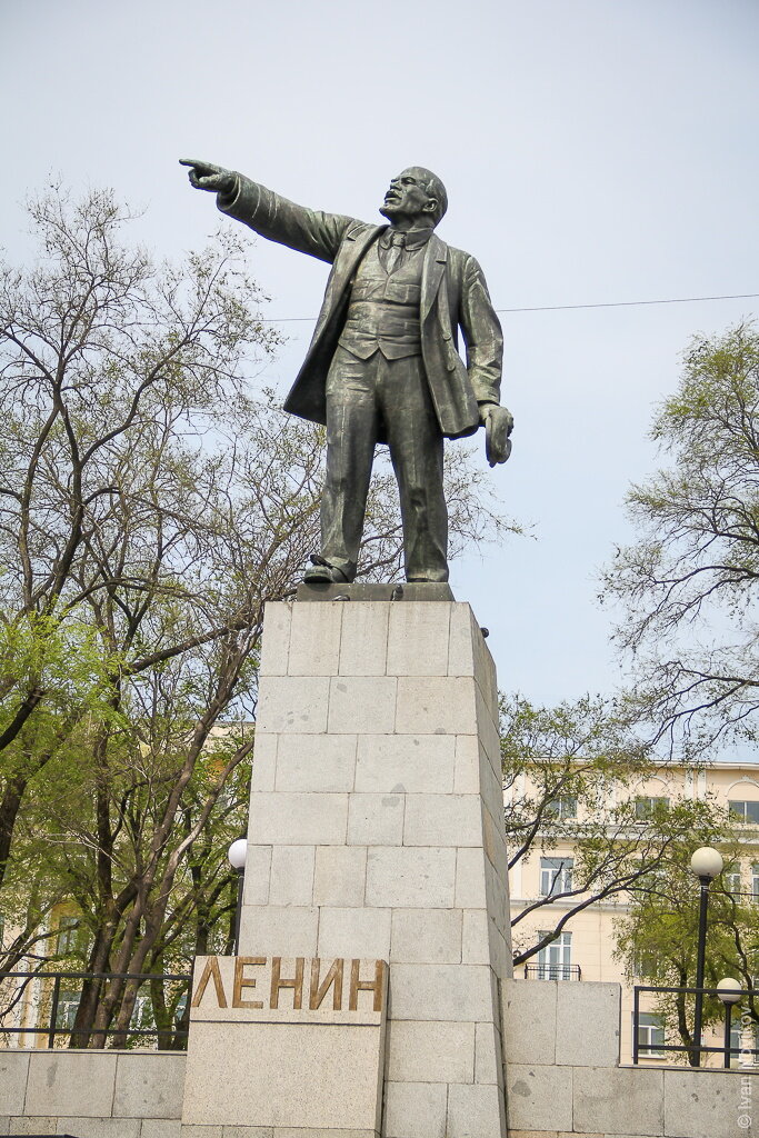 Владивостокский Ленин в меру задорен, короток, и если смотреть сзади, как бы резко опускает согнутую руку, словно готовясь выпалить: